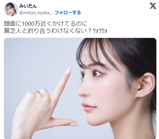 整形女子「顔面に1000万近くかけてるのに 貧乏人と釣り合うわけなくない?wウォウウォ」