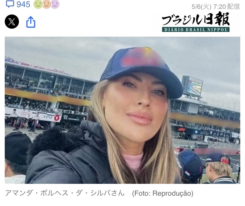 アマンダさんはゴイアス州カルダジーニャ市の出身で、言語学の修士号を持つ研究者。アジア各国を旅しており、F1鈴鹿グランプリ観戦に4月に訪日していた。滞在中には地方の街並みや新幹線の安全性に感銘を受け、「ここに住みたい」とSNSで語っていた。