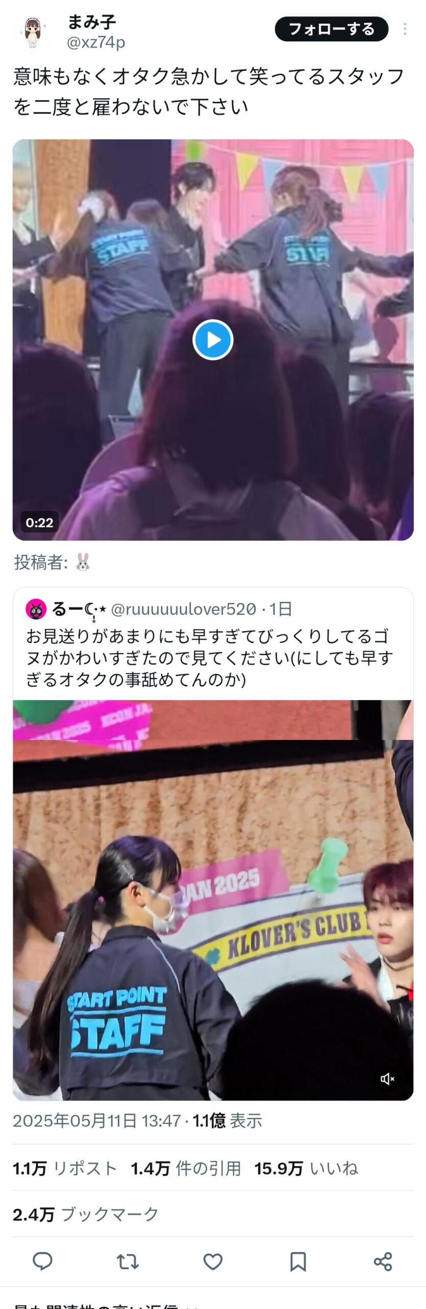 K-POPアイドルイベントでシュシュ女スタッフの客への対応が酷すぎて1億インプレの大炎上→ジャップが個人情報特定へ