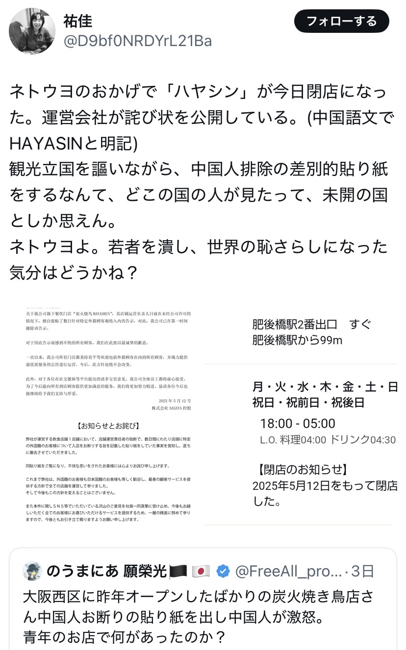 中国人お断りの張り紙をした焼き鳥店、ネトウヨに応援されてしまい閉店wwwwwwwwwwwwwwwwww