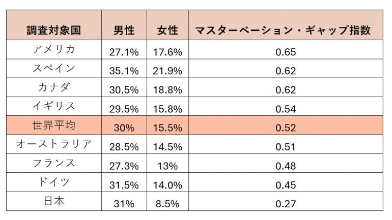 週に複数回(1回以上)マスターベーションを行なう割合は、男性が30%、女性が15.5%にとどまり、世界全体の平均マスターベーション・ギャップ指数は0. 52という結果が得られた。