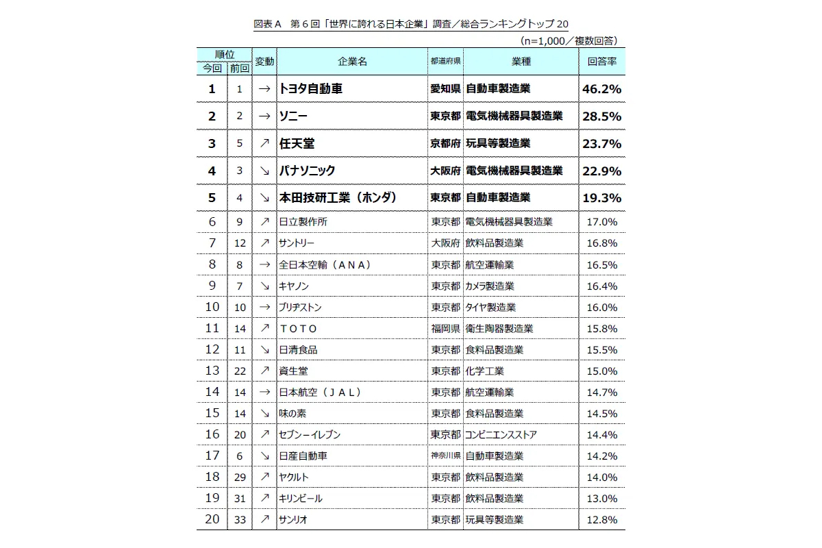 20~69歳の男女1,000名を対象にインターネットで行われた。世界に誇れる日本企業1位はトヨタ自動車、製造業がトップ20の過半数占める