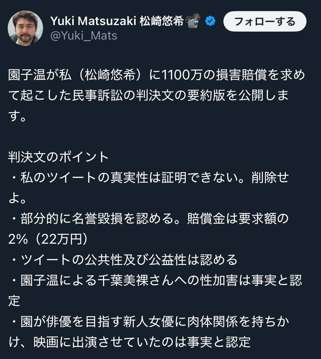 園子温、勝訴。レイプ犯などと書いた俳優の松崎悠希に22万円の支払い命令