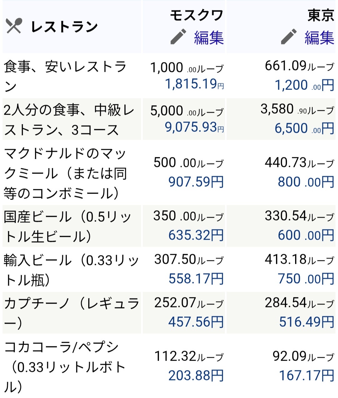 レストランも衣類も家賃もモスクワのほうが上な模様