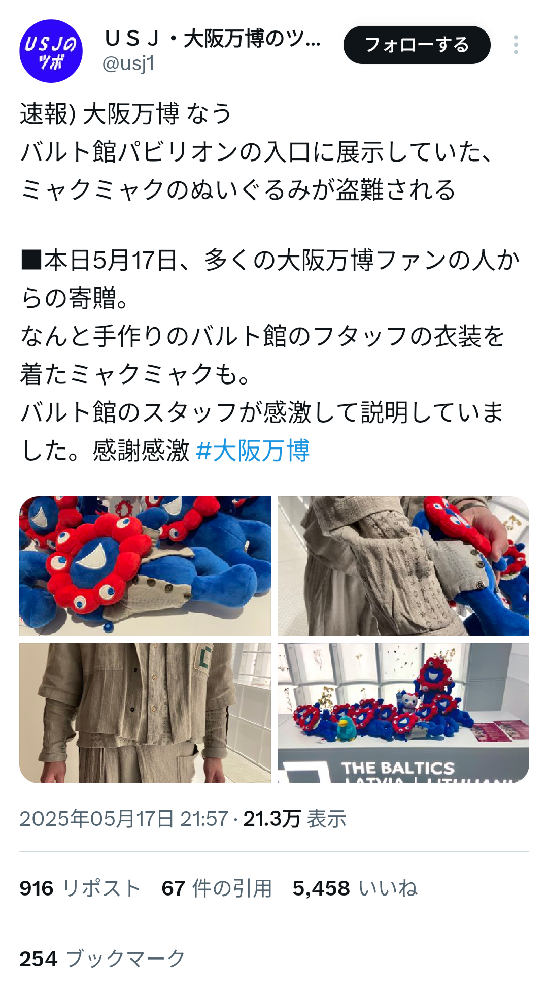 盗難事件を知った大阪のおばはん達がミャクミャクぬいぐるみを大量にプレゼントする