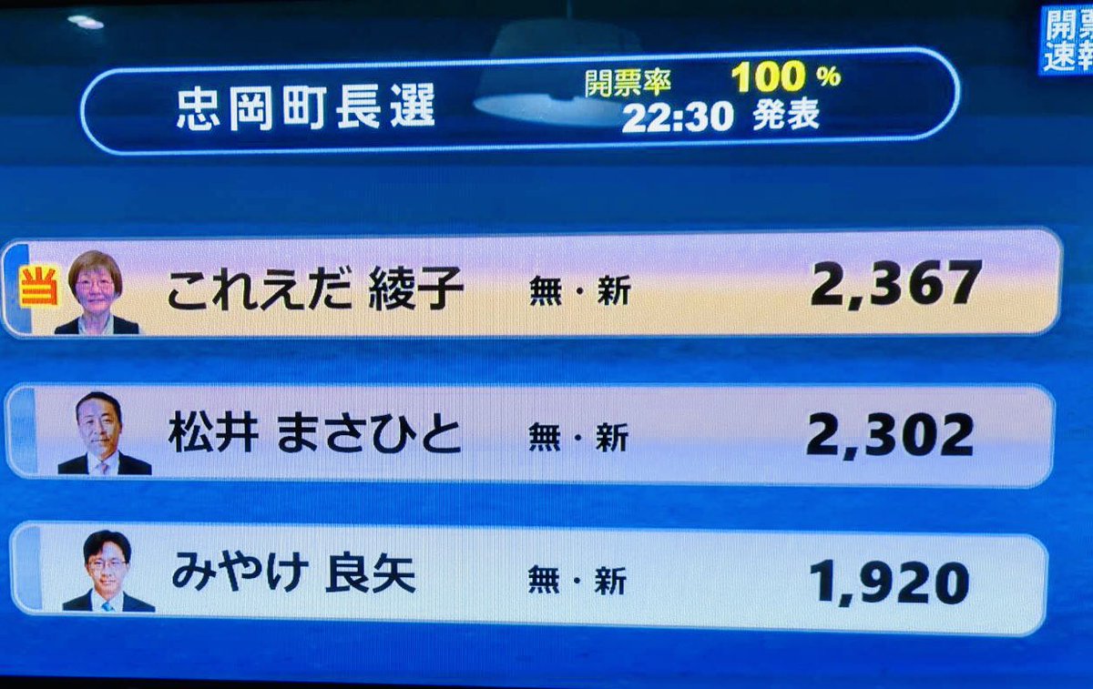 開票結果は、是枝氏が2367票を獲得。いずれも無所属新人で元町議の松井匡仁氏(55)が2302票、