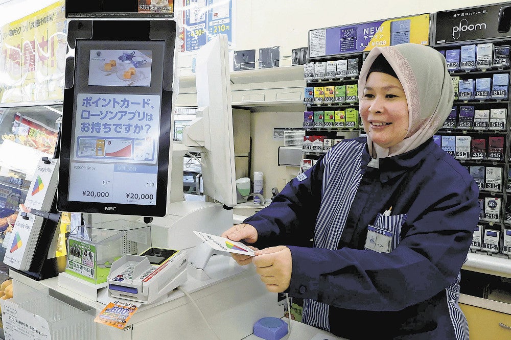 4月21日夜、青森市の「ローソン浪岡福田店」店長のへニー・スシラワティーさん(45)(インドネシア出身)は、レジにプリペイドカード2枚を持ってきた高齢の男性客の対応にあたった。