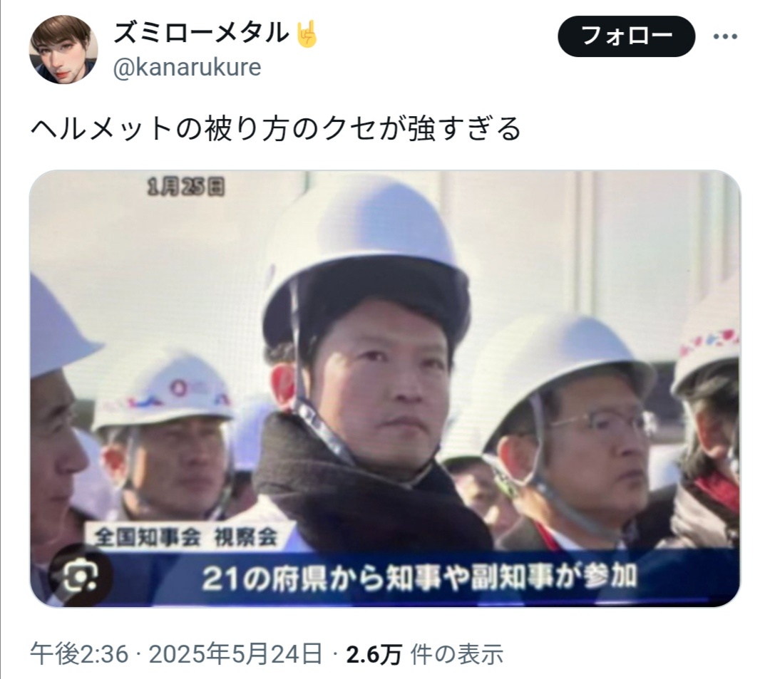兵庫県知事・斎藤元彦氏、ヘルメットの被り方にハゲしい違和感【重大疑惑】