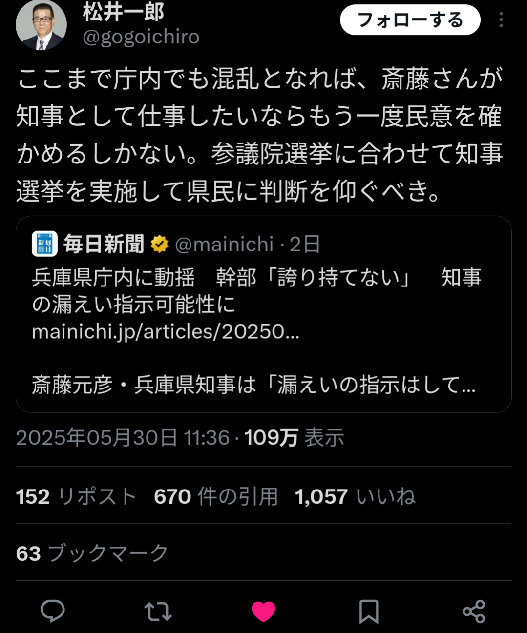 維新・松井一郎議員が怒りあらわ「斎藤は知事を続けたいと思ってるなら、再び辞任して選挙を行い民意の判断を仰げ」