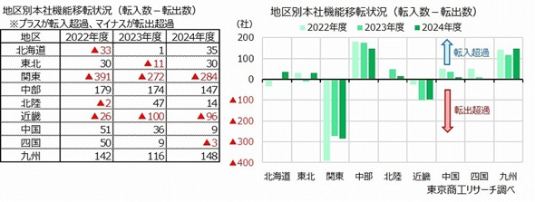 一方、転出超過だったのは、関東(284社減)、近畿(96社減)、四国(3社減)の3地区だった。特に関東の転出超過数が多く、地方への流出に歯止めがかからず、4年連続で転出超過となった。