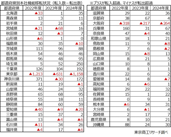 ほかに、「大阪府」は264社減、「愛知県」が20社減と、大都市圏の中心部から周辺都市に転出する傾向が目立った。