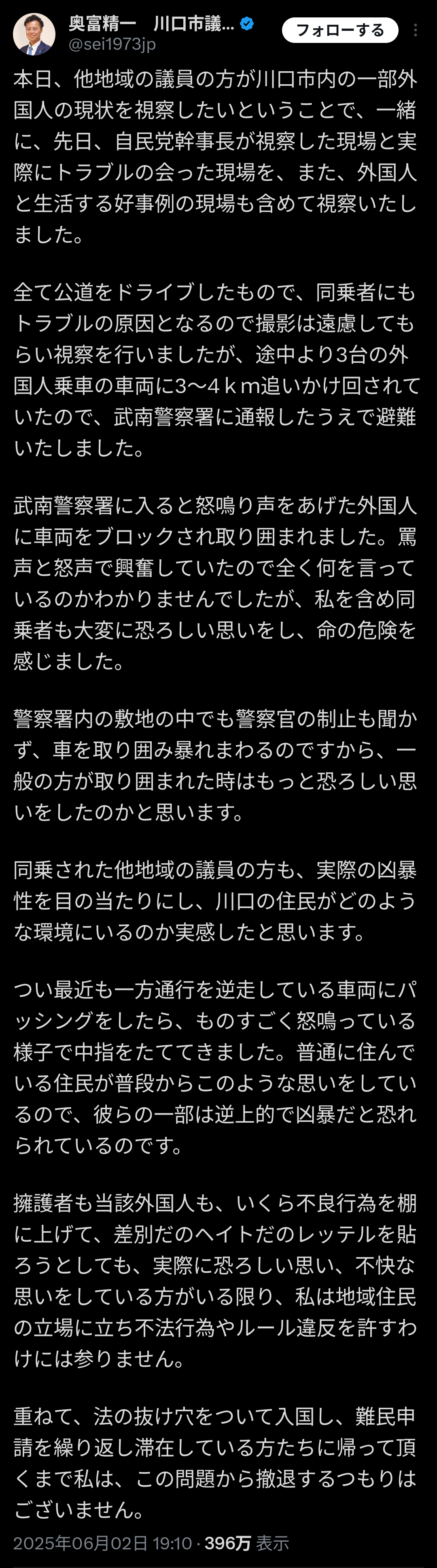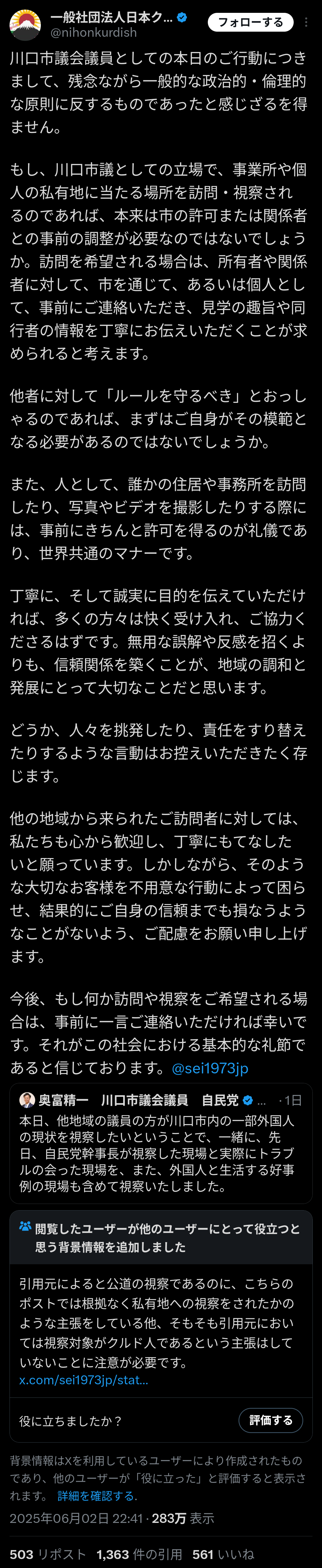 【特悲報】埼玉・川口市を視察して大炎上した議員、そもそもクルド人の許可を得てなかったことが発覚wwwどうすんのこれ?