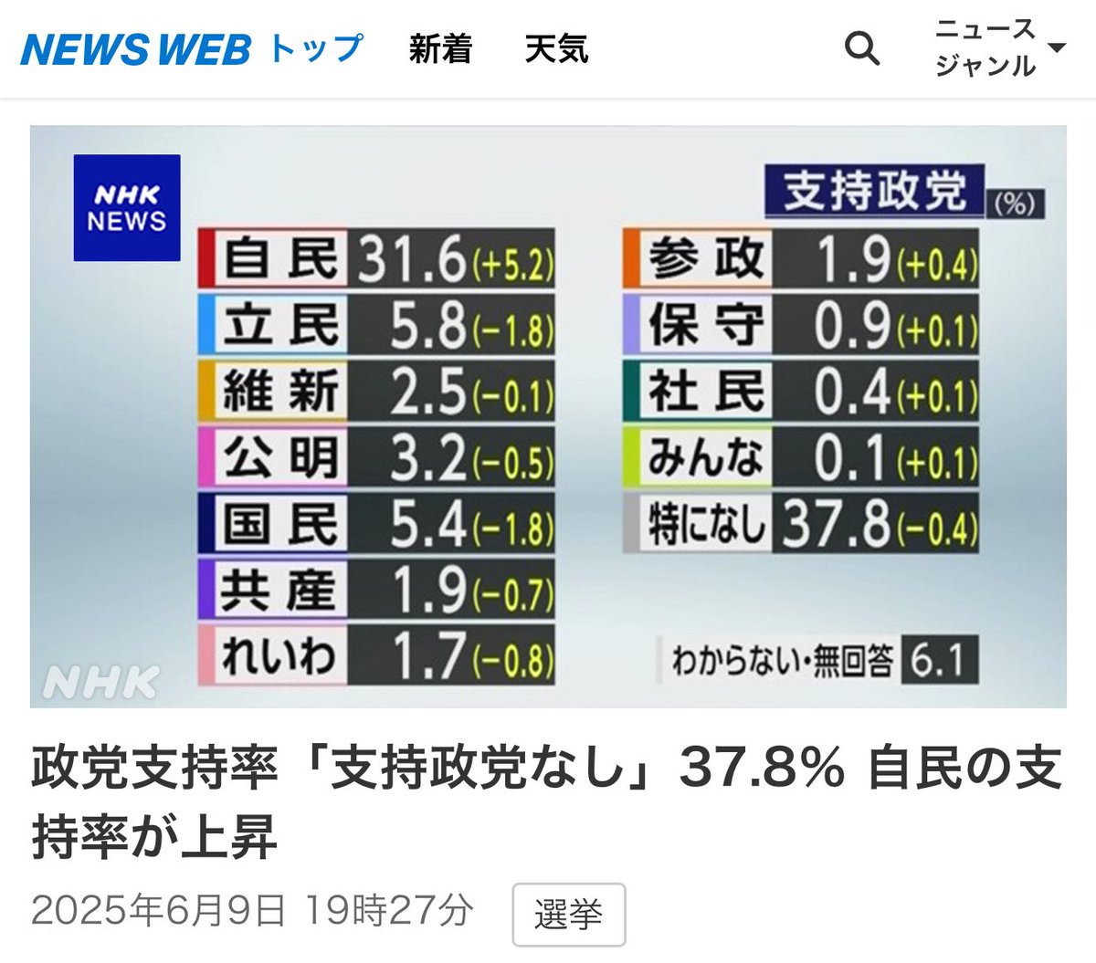 なんでこんな政治情勢で自民が上がるんや? - 43 名前:一般よりも上級の名無しさん 投稿日時:2025/06/09(月) 22:07:41.61 ID:9NujN0+s0