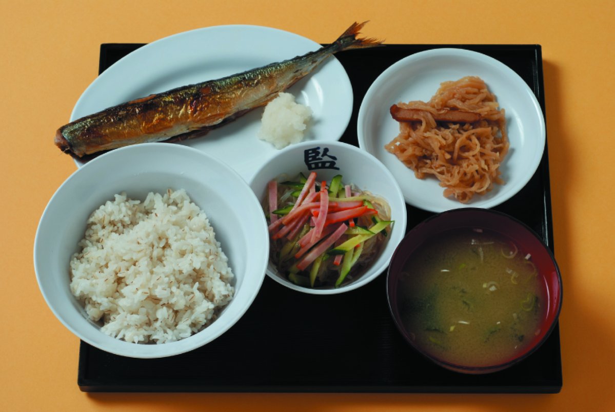 「現在の網走刑務所で提供されている食事を再現したメニューで、米7割、麦3割のごはんと味噌汁、焼き魚、副菜がセットの定食」と記し、栄養バランスの取れた食事メニューを披露。(※公式サイトによると、本来はみそ汁ではなく番茶が出されているとのこと)