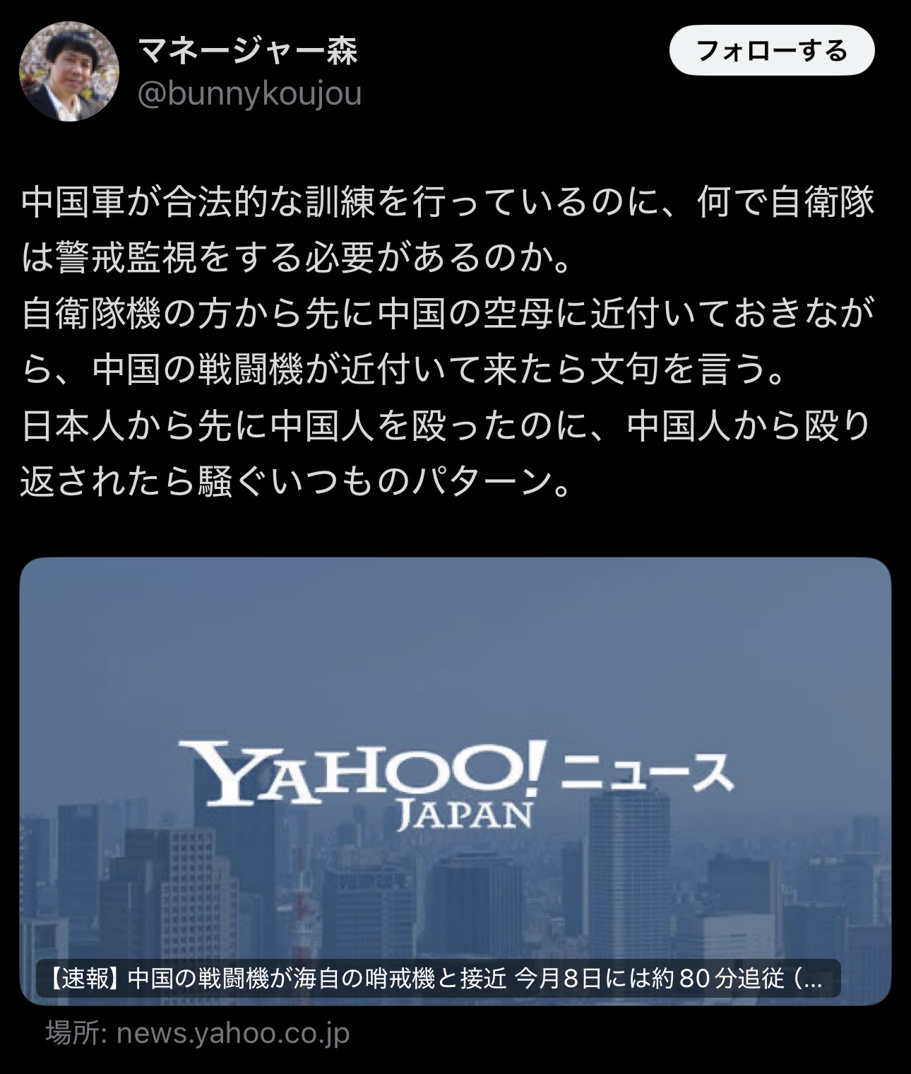 「日本側が中国軍の艦載機を監視して追跡しているのに、空母『山東』の艦載機が異常接近したと逆にクレームを入れている」と主張しています。