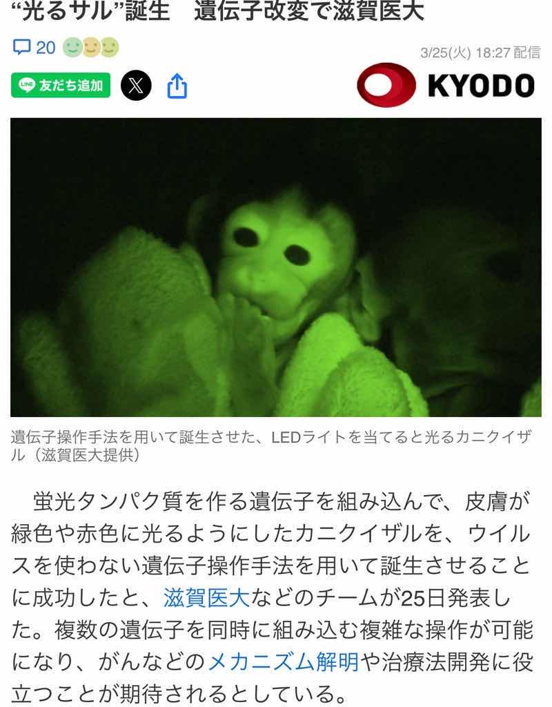 遺伝子操作で蛍光タンパク質を入れ 光サルを作る事に成功 日本の滋賀医大😢(画像あり)