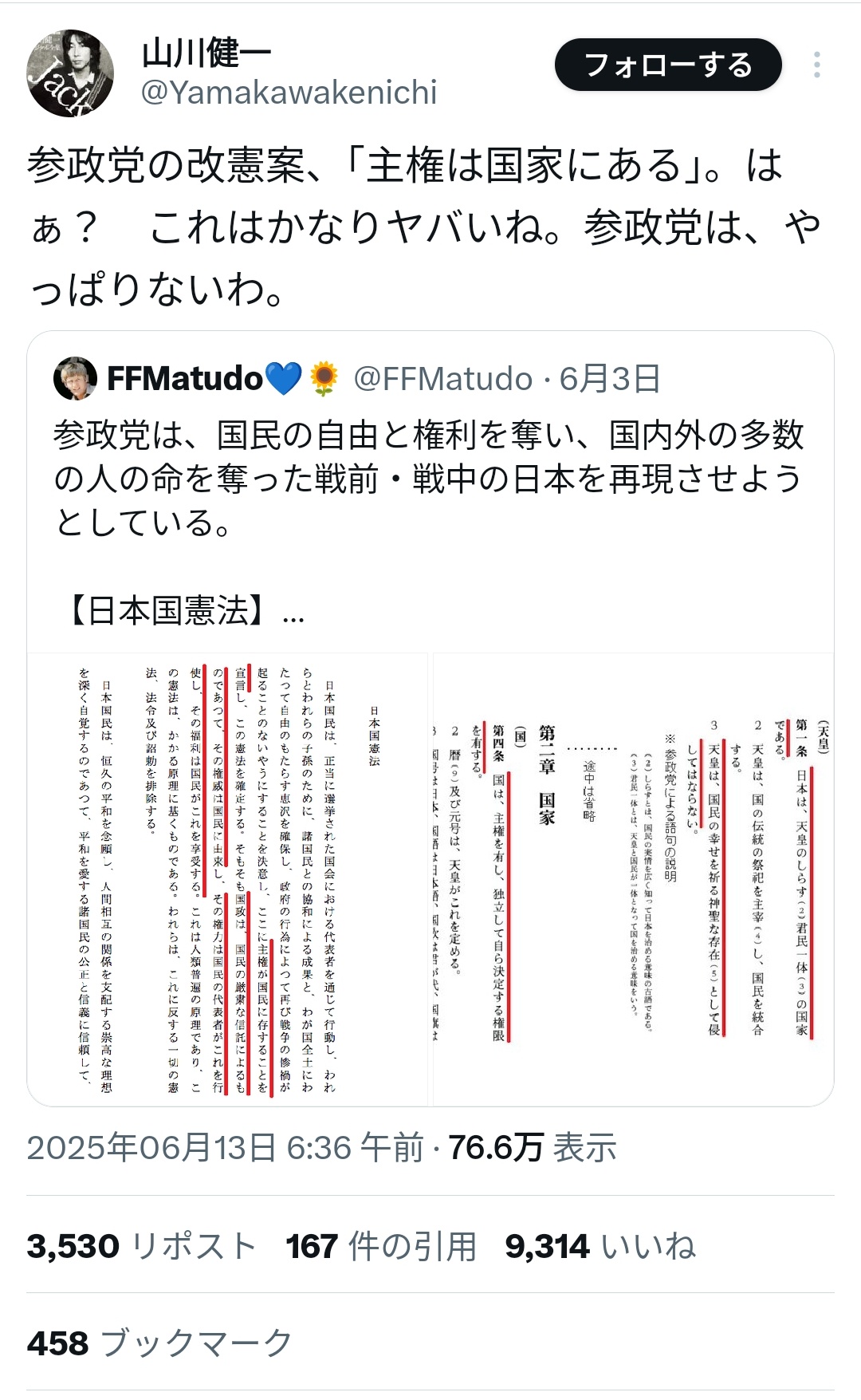 でも自民改憲案も似たような事書いてなかった? - 14 名前:一般よりも上級の名無しさん 投稿日時:2025/06/14(土) 14:01:26.00 ID:E0sGVu0x0