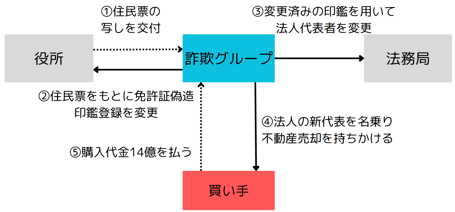 ・容疑者が法人の新代表を名乗り、買い手に不動産売却を持ちかける