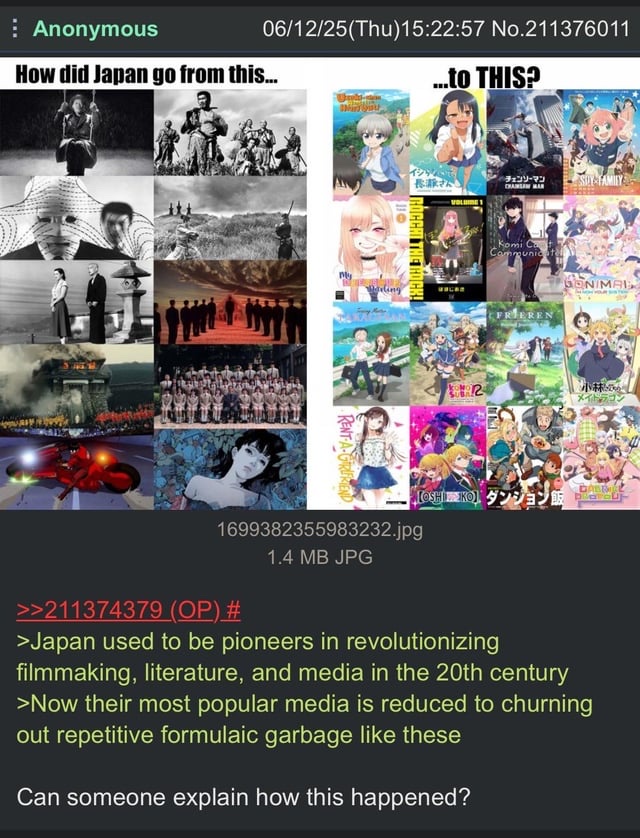海外のオタク「20世紀の日本は映画、文学、メディアに革命をもたらした先駆者だった。しかし今はゴミアニメを量産するだけ」