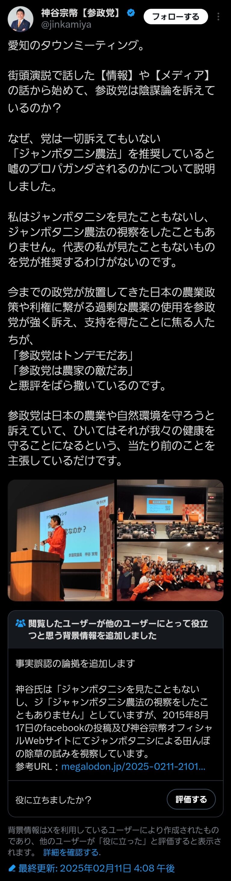 参政党神谷「私はジャンボタニシを見たこともないし農法視察もしてません😤」→一瞬で嘘だとバレる