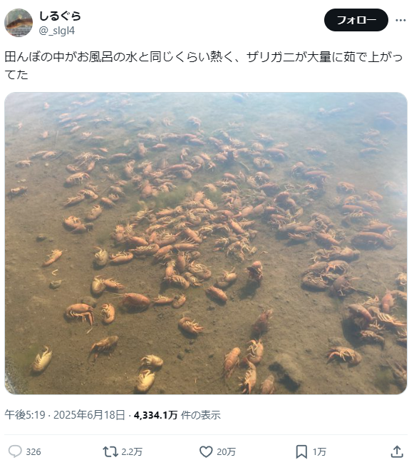 田んぼが熱すぎてザリガニが稲に集団でしがみついてるのがXであったな