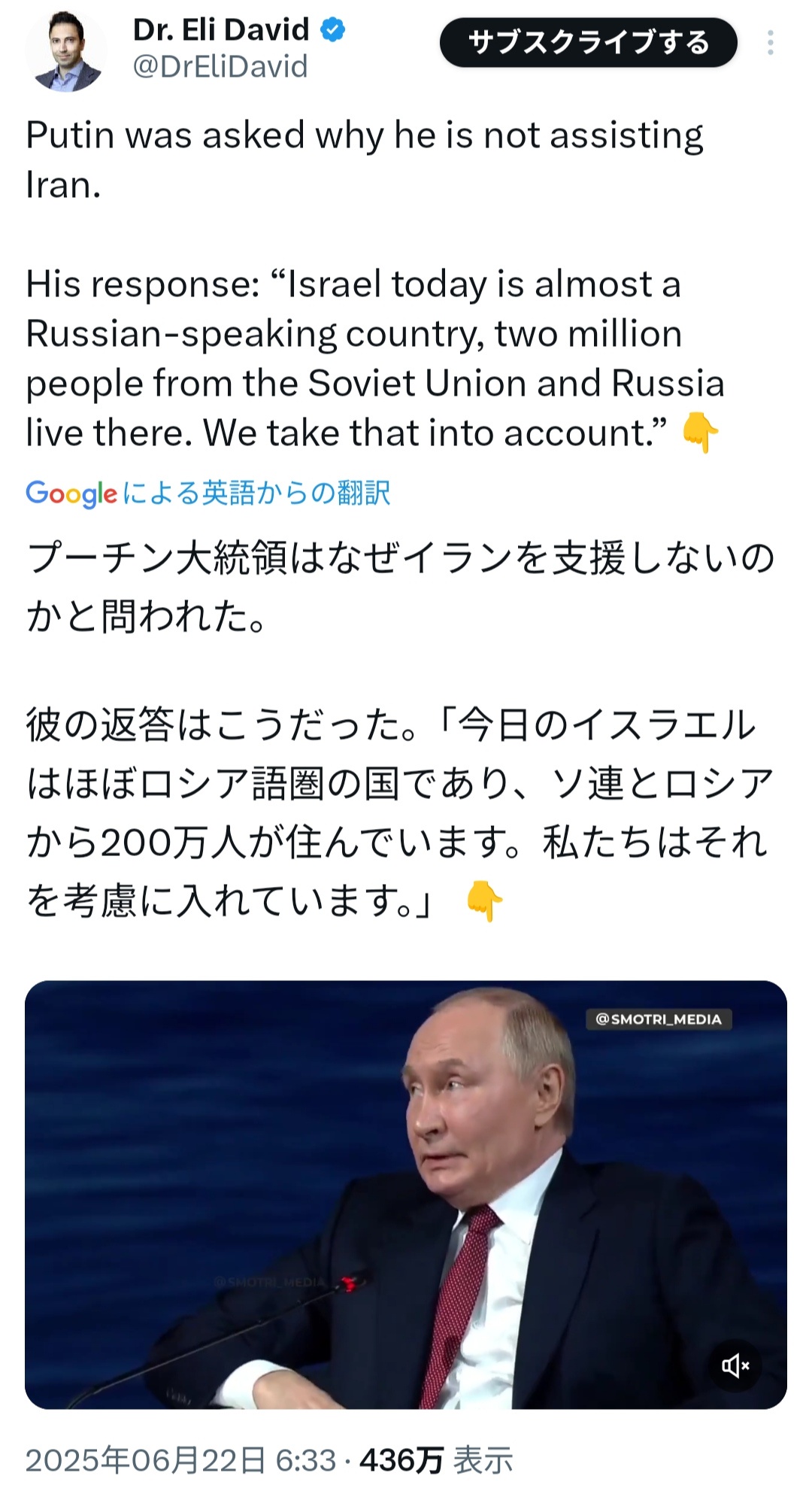 プーチン「イランには悪いけど、もう支援できない。イスラエルにはロシア系住民が多いんだ」