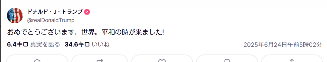 これでもうノーベル平和賞は確実だ - 24 名前:一般よりも上級の名無しさん 投稿日時:2025/06/24(火) 05:53:31.37 ID:fgFMJOpP0