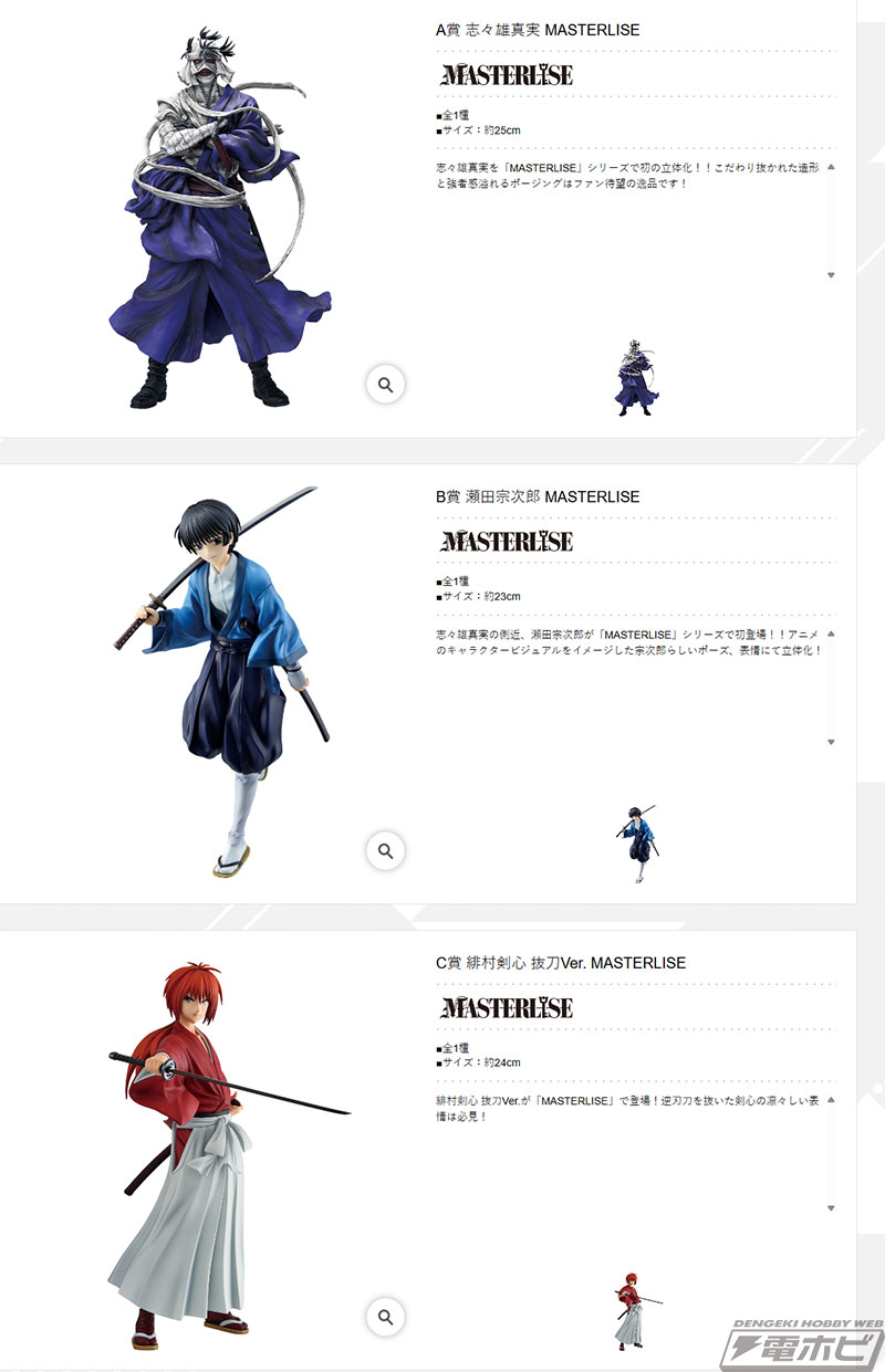 志々雄真実や瀬田宗次郎、緋村剣心 抜刀Ver.のフィギュアが当たる一番くじ。強者感溢れる志々雄のポージングやアニメのキャラクタービジュアルをイメージした宗次郎、逆刃刀を抜いた剣心の凛々しい表情などに注目です。このほか、墨絵風イラストがかっこいい湯呑み、和柄がアクセントのラバーコースターなども登場。そしてラストワン賞は、「志々雄真実 修羅照炎Ver. MASTERLISE」。修羅の炎に照らされたイメージの特別彩色に注目! - 3 名前:一般よりも上級の名無しさん 投稿日時:2025/06/26(木) 22:25:58.18 ID:QJi86UAi0