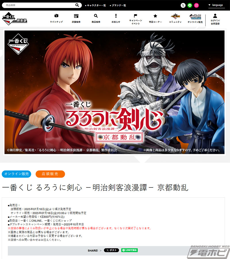 BANDAI SPIRITS ロト・イノベーション事業部の公式サイト「一番くじ倶楽部」にて、「一番くじ るろうに剣心 -明治剣客浪漫譚- 京都動乱」の全賞品ラインナップが公開されました。2025年7月18日(金)より順次発売予定です。