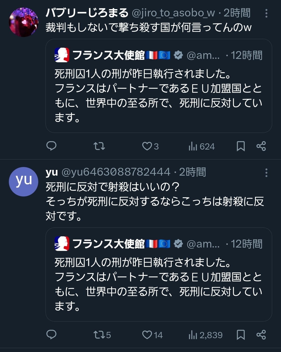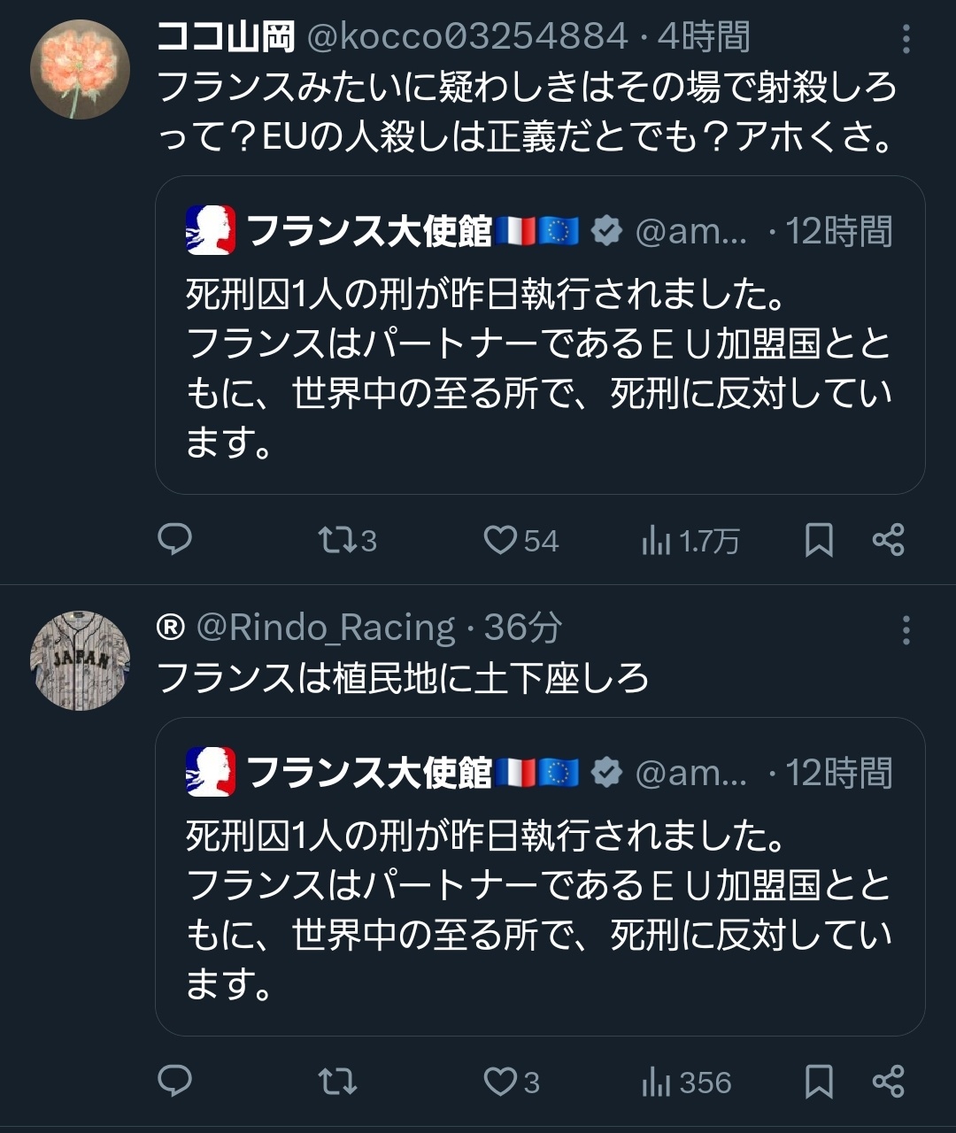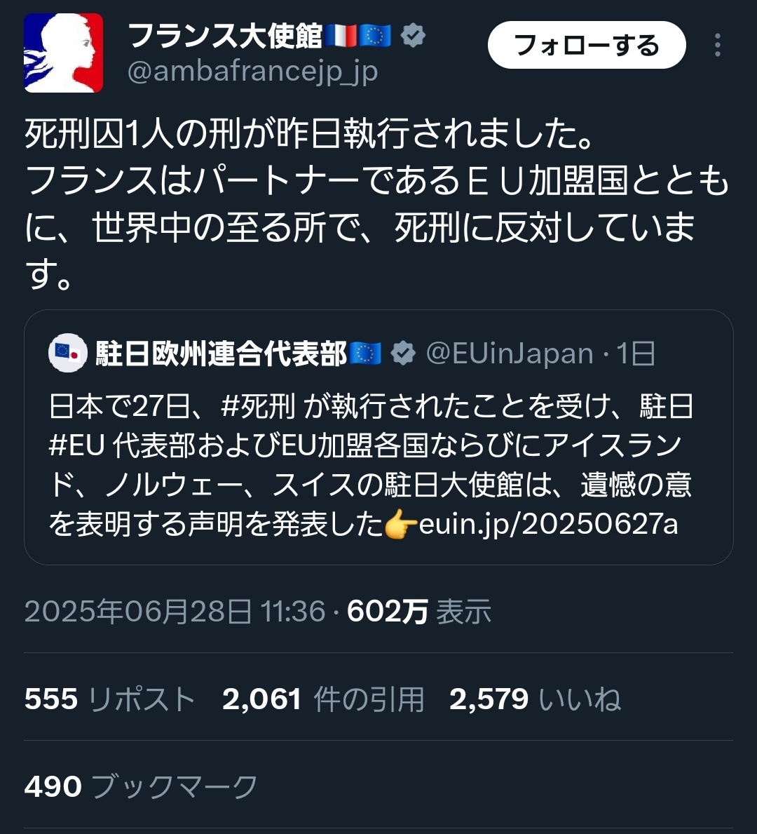 【画像】フランス「日本の死刑執行に抗議します💢」