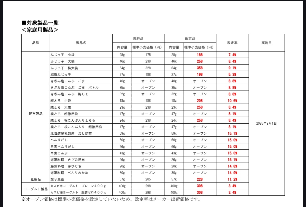 同社の代表的な商品の塩昆布「ふじっ子 小袋」は標準小売価格(税別)で175円から188円になる。あわせて業務用でも昆布製品4品目を25年12月出荷分から8~10%値上げする。