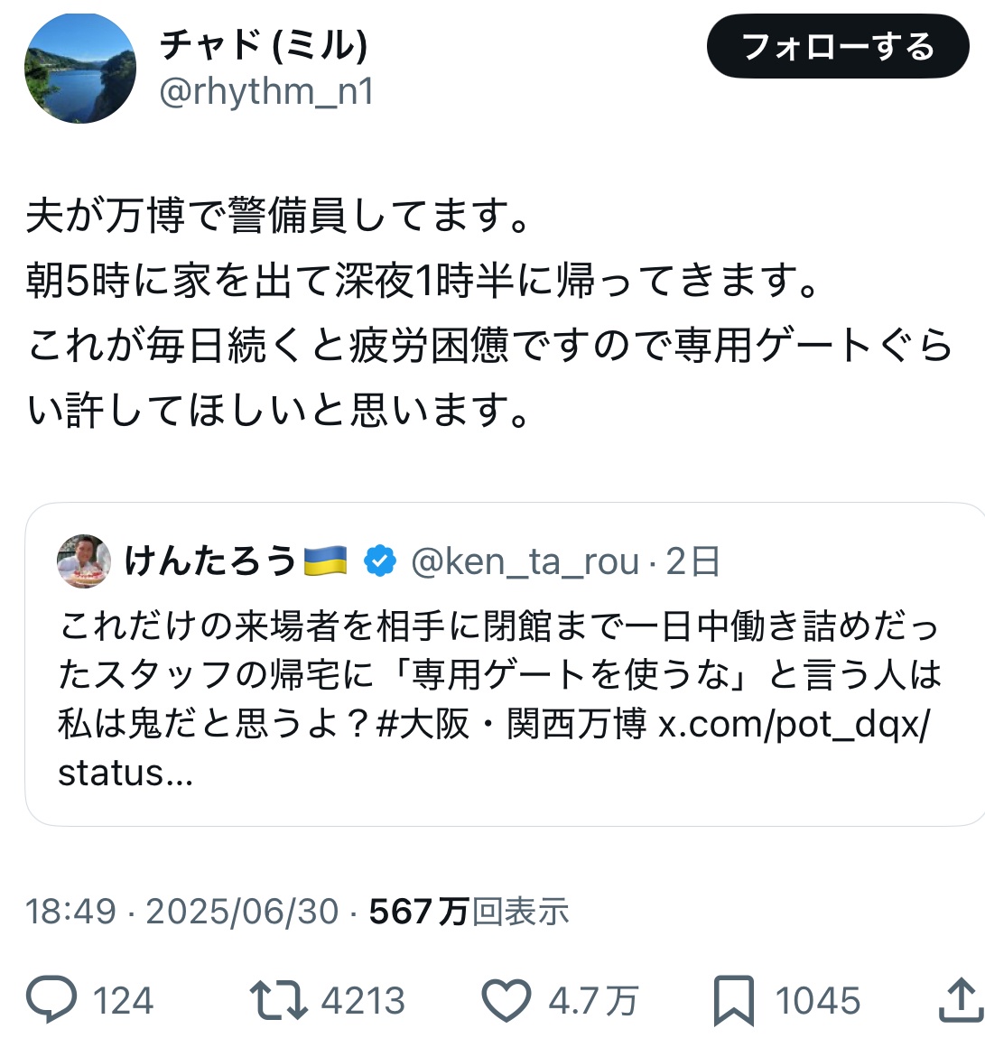 万博警備員、毎日朝5時から深夜1時半までの長時間労働を頑張っていた✨