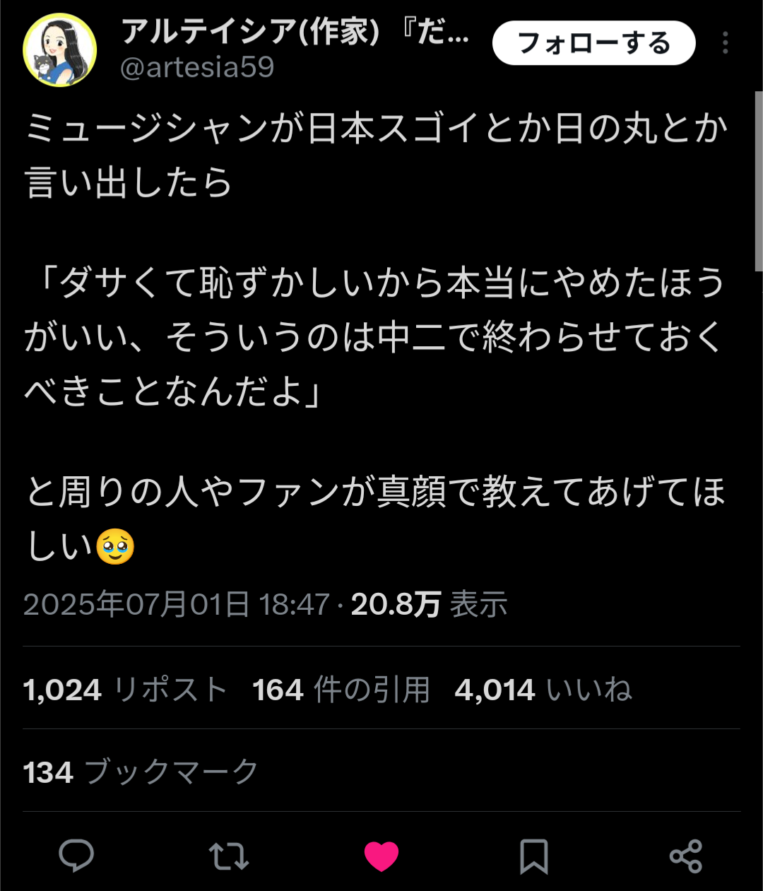 【正論】人気作家「ミュージシャンが日本スゴイとか言い出したらそれはダサい事ってちゃんと周りの人が注意しなきゃダメ!😡」