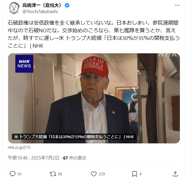 高橋洋一「石破政権は安倍政権を全く継承していないな。日本おしまい、参院選期間中なので石破NO、時すでに遅し」