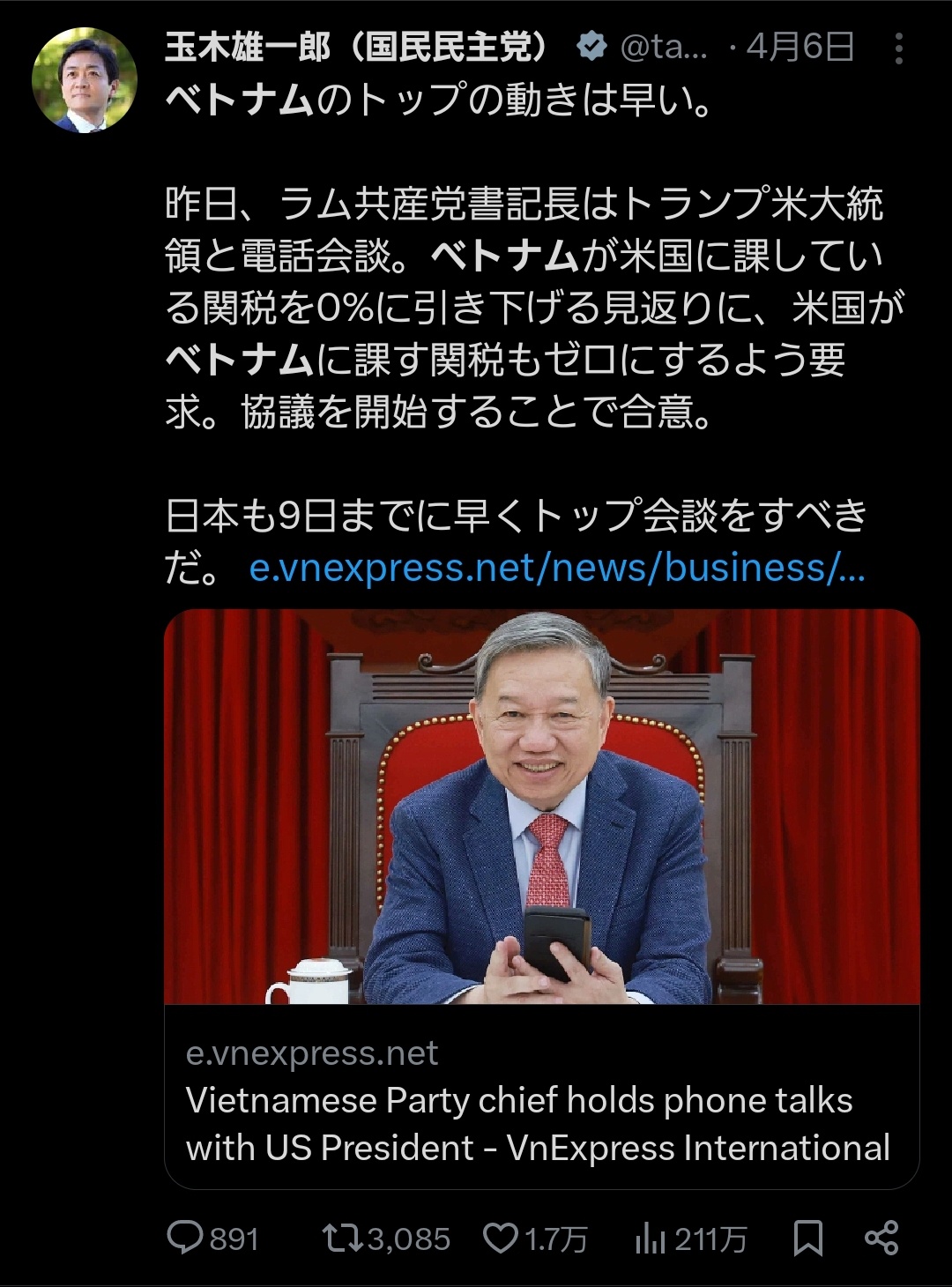 国民・玉木「石破はベトナムの交渉を見習え!」→ベトナム、トランプに敗北
