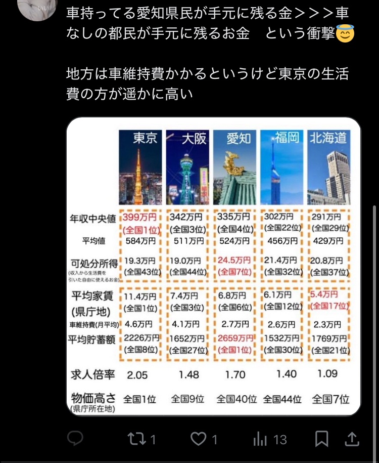 なんか最近「子育てなら東京一択。東京最高。ゆりこママー」みたいなツイートがよくバズってるけど、まんまとバラマキに騙されてて草東京住んでるだけで全国最下位レベルの可処分所得になるし、家が高すぎて子供作れず出生率0.99で全国最下位の東京が子育てしやすいわけないだろ。