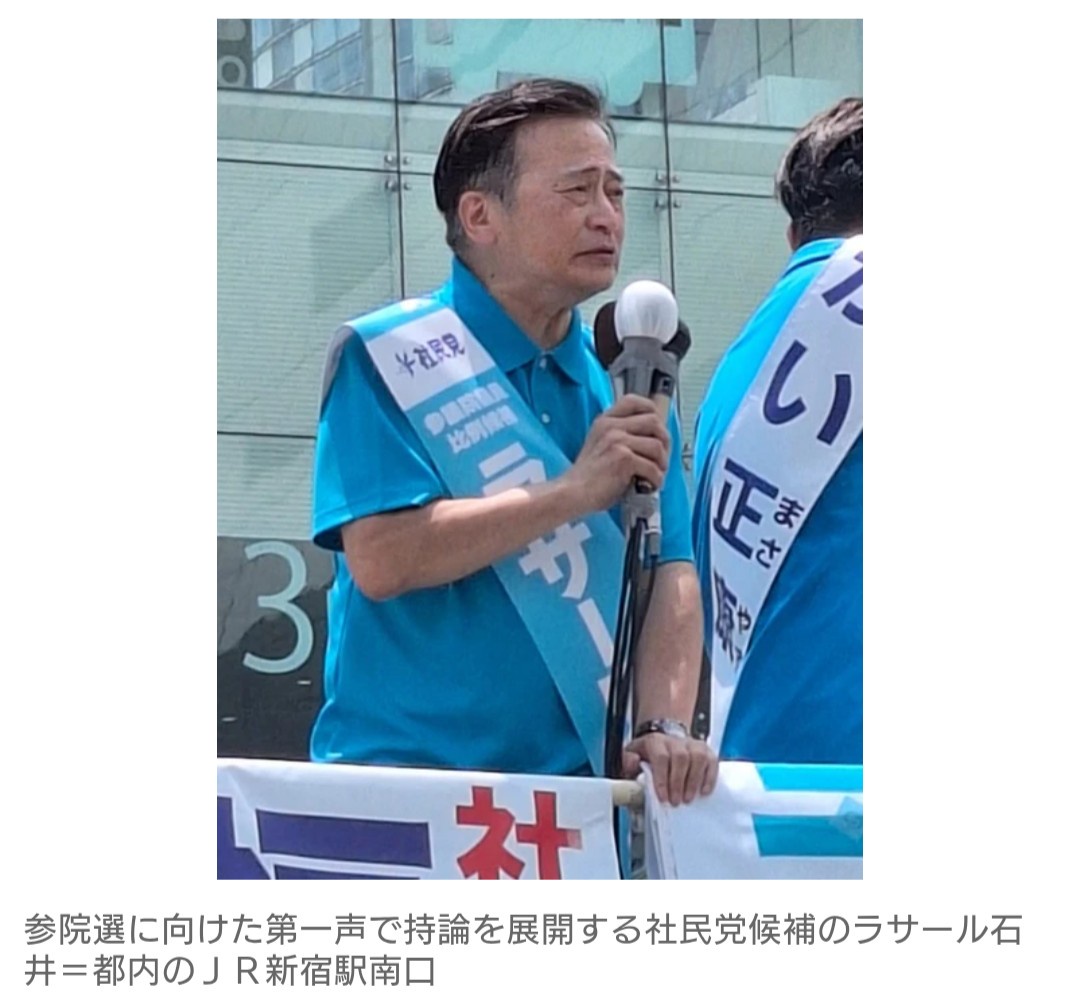 参院選(20日投開票)に社民党から比例区で出馬した俳優・タレントのラサール石井(69)が3日、東京・JR新宿駅南口で第一声を上げ、「日本人ファースト」に疑問を投げかけた。