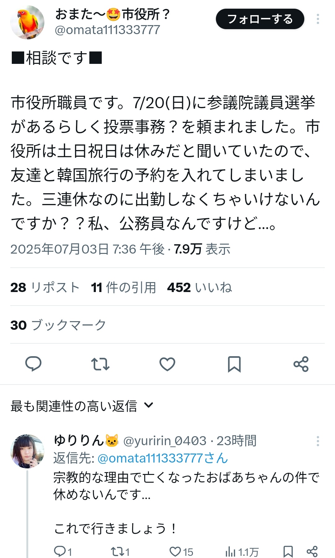 本物の市役所職員なら、参院選の投開票日に仕事があるなんて織り込み済み
