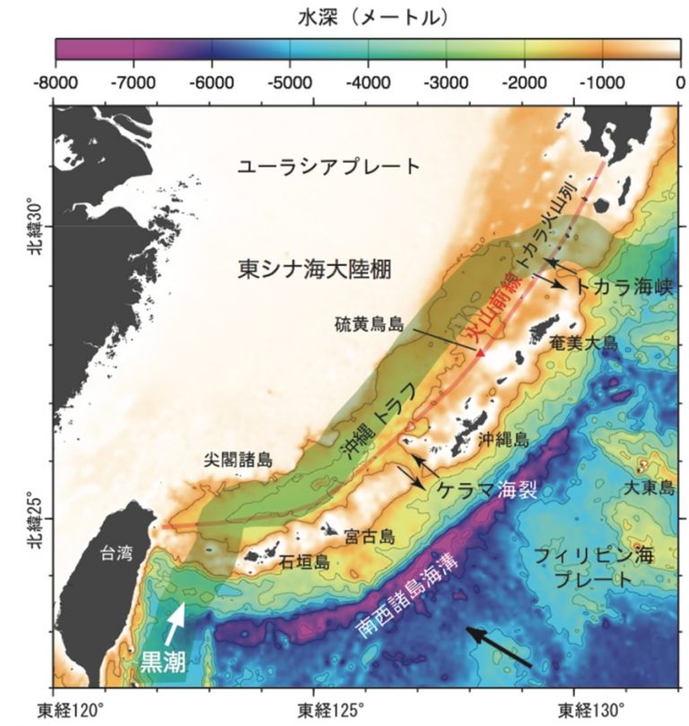 トカラ列島の西側には「沖縄トラフ」と呼ばれる海底地形が広がっています。
