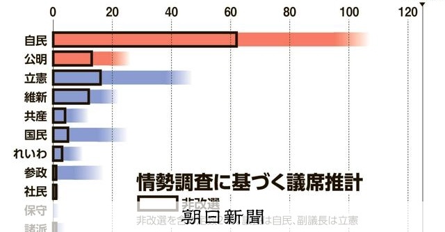 自民と公明の与党は、非改選を含めた定数の過半数(125議席)の獲得が微妙な情勢になっている。