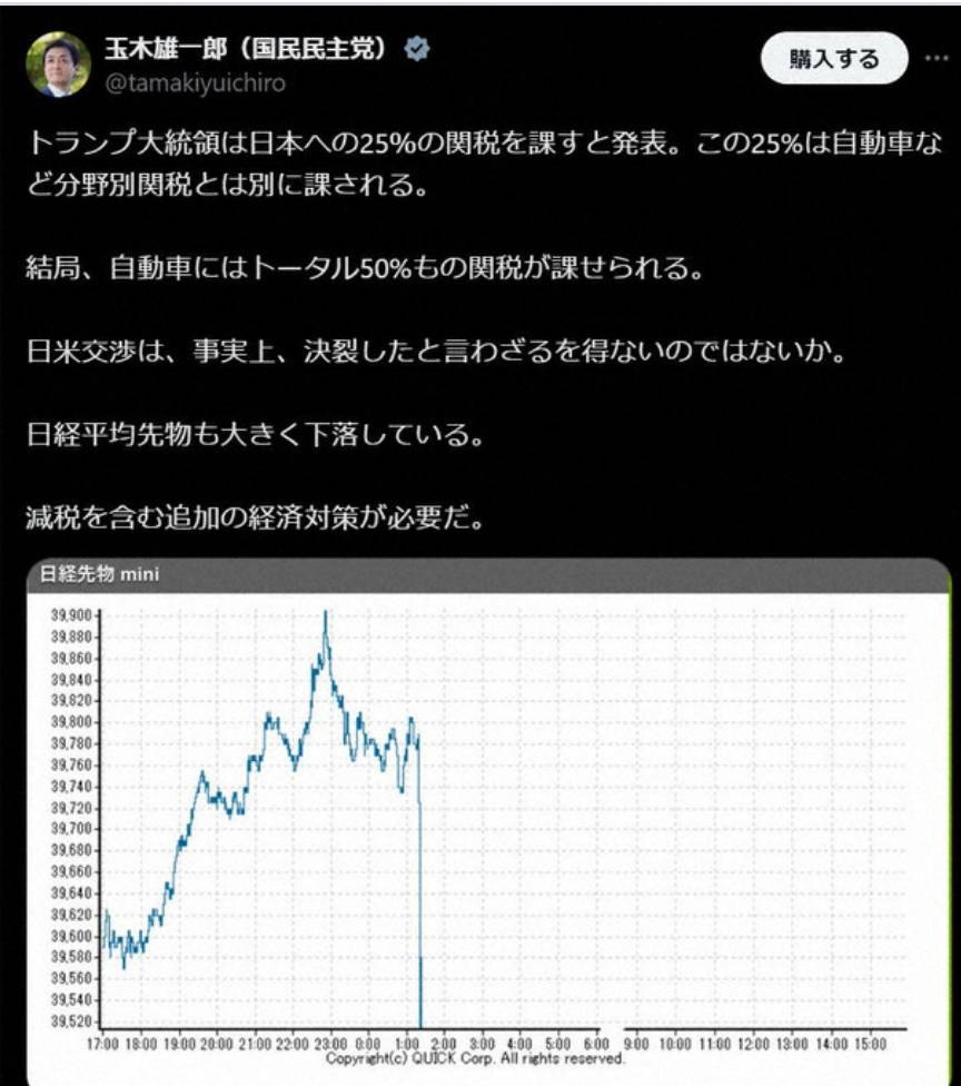 玉木氏は、トランプ氏の発表直後の8日午前1時45分に、25%の関税措置について「自動車など分野別関税とは別に課される」として、日経平均先物の推移を示すグラフを添付し「大きく下落している」と投稿した。