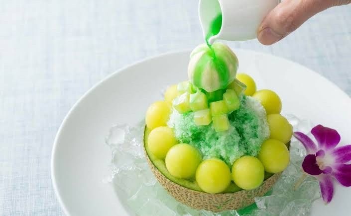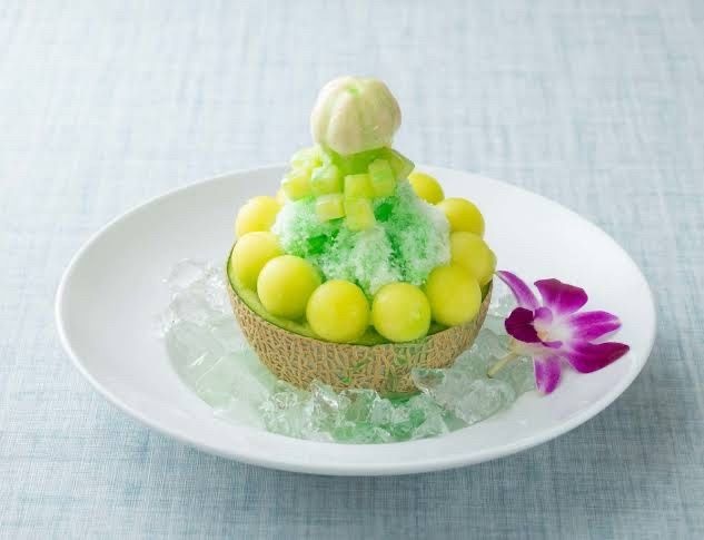 ラウンジ「ORIGAMI」では4種類のかき氷を用意。「ザ・メロンフラッペ」(5,692円)は、国産のアールスメロン2分の1個分を使ったかき氷。半分にカットしたメロンをくりぬいた器に、氷を盛り、丸くくりぬいたメロンの果肉やバニラアイスを添えて仕上げる。