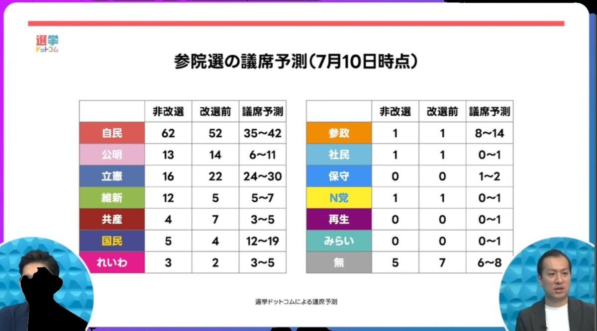 れいわ少ないなあ、6年前で2議席だからあんま伸びてないなあ