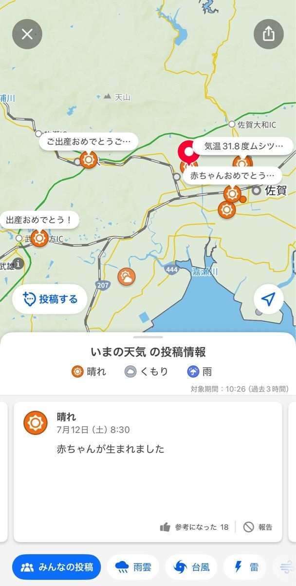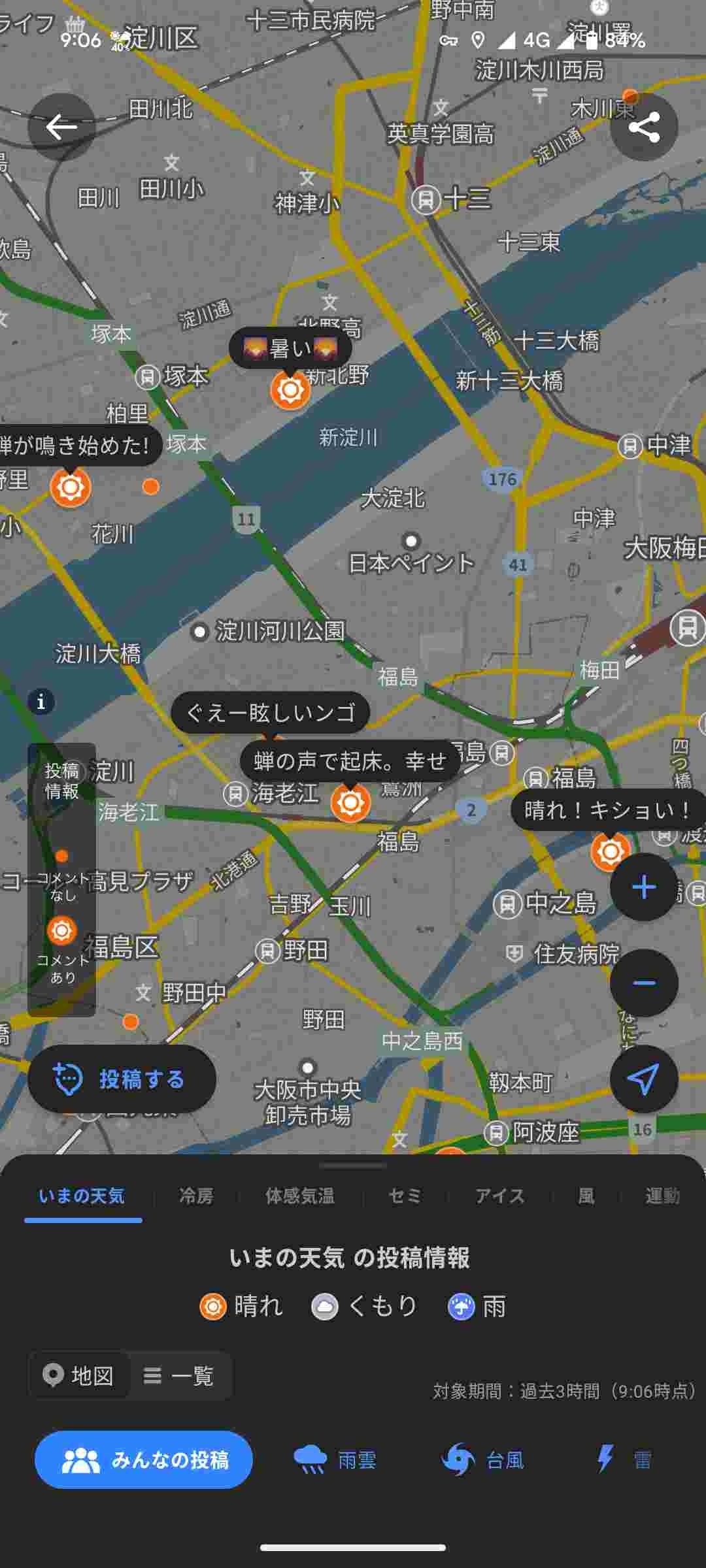 今探したら雨雲レーダーの横の投稿てとこから行けた