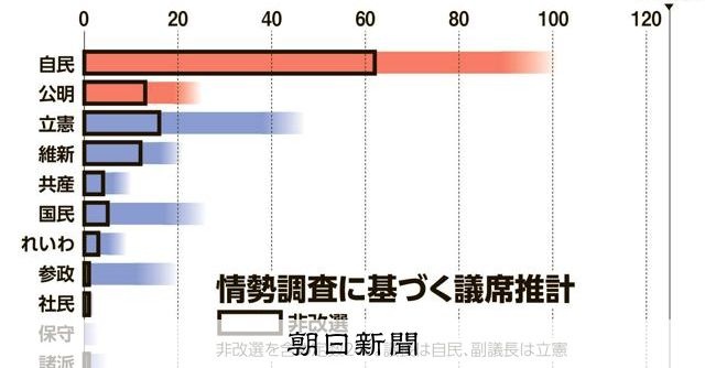 7月20日投開票の参院選について、朝日新聞社は13、14の両日、全国の有権者を対象に電話とインターネットによる情勢調査を行った。取材で得た情報も加え、終盤情勢を探った。自民、公明の与党は序盤情勢より劣勢となり、非改選を含む定数の過半数(125議席)の維持は困難な情勢となっている。自民は比例区も苦戦し、選挙区とあわせて30議席台半ばとなる公算が大きい。国民民主は伸長、参政は勢いを強め、いずれも改選議席数を大きく上回る情勢だ。