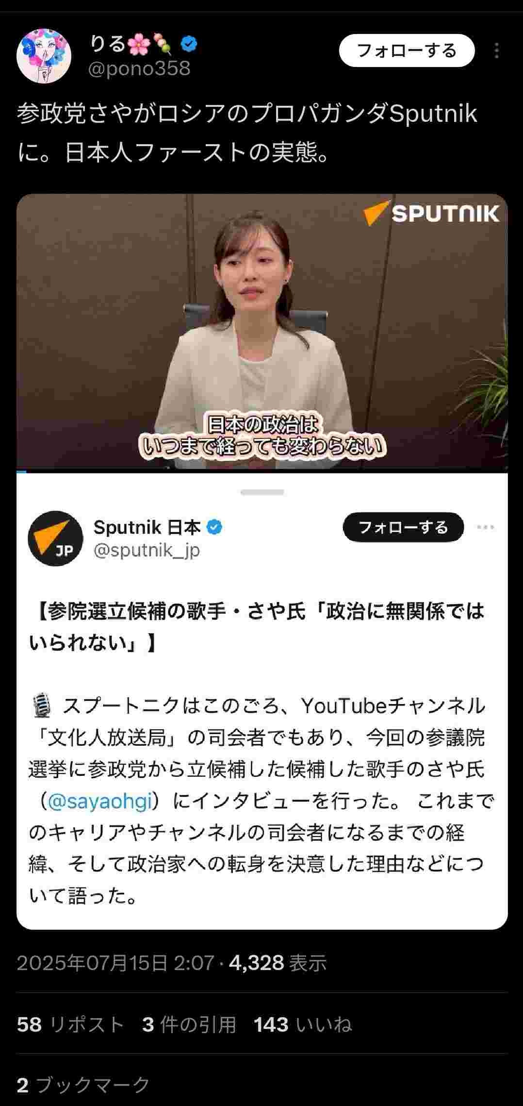 さや候補がSPUTNIK(ロシアのプロパガンダ垢)に何故か出演