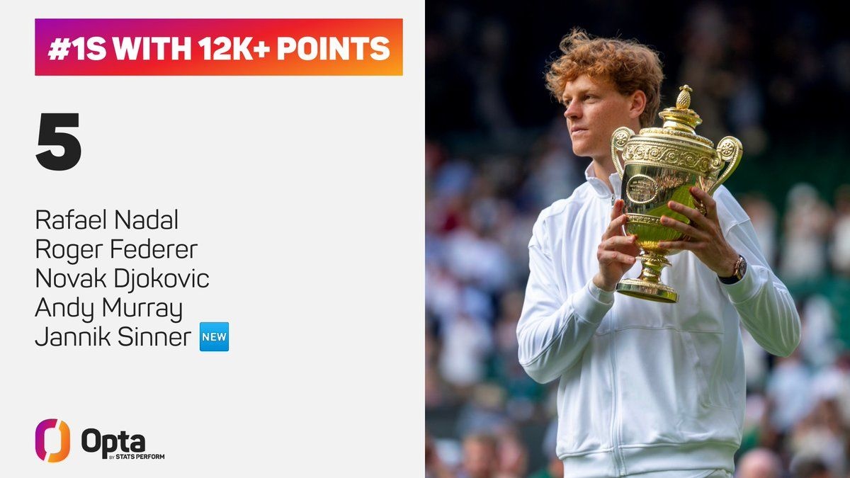 Since the inaugural ATP Tour season in 1990, Jannik Sinner is now just the fifth ATP #1 to crack 12,000 rankings points along with Rafael Nadal, Roger Federer, Novak Djokovic and Andy Murray. Undisputed.