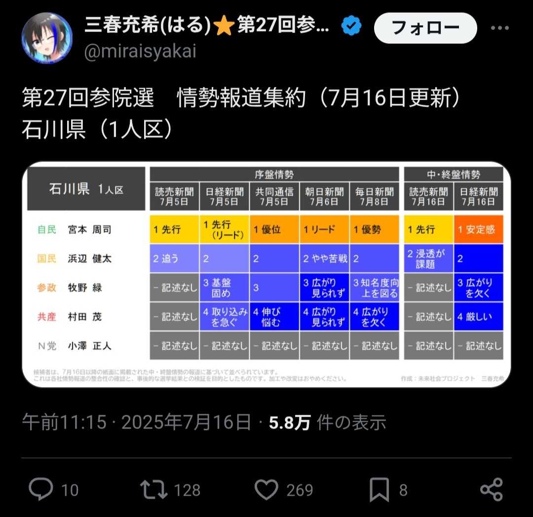 今まで選挙区で自民以外が勝ったことない隣の富山県でも、今回は国民民主が優勢なのに。