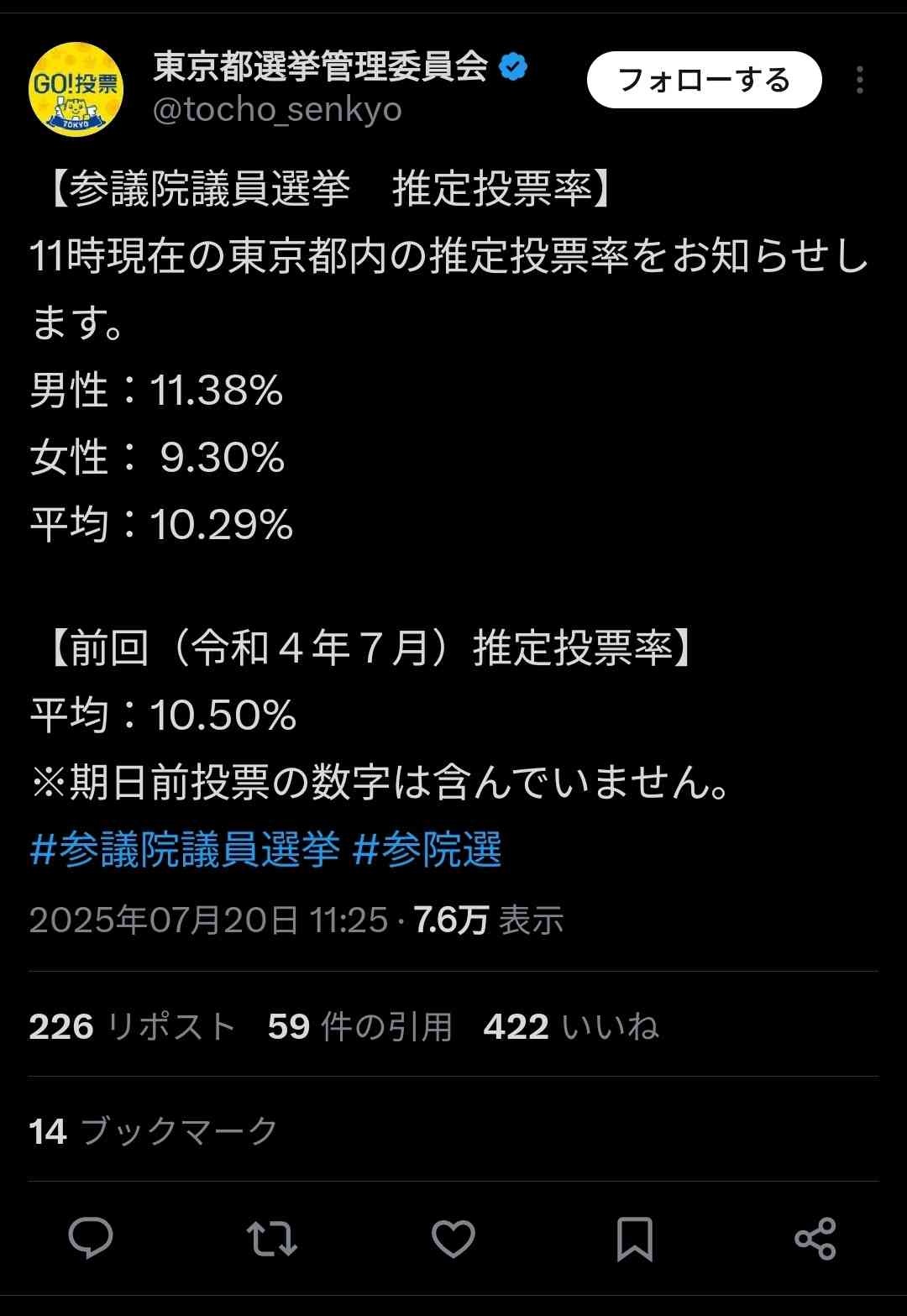 期日前投票で有権者全体の20.8%が投票してから今んとこ合わせて30%ぐらいやね