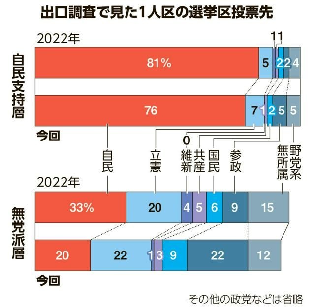 参院選全体の勝敗を決してきた改選数1の1人区。伝統的に自民の支持基盤が厚い地域が多いとされるが、7月20日の投開票日に朝日新聞社が実施した出口調査では、その基盤が細ったうえに、保守的な政策を掲げた参政に無党派層の支持で侵食されている様子が目につく。
